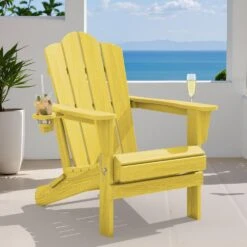 Classic Outdoor HDPE Folding Plastic Adirondack Chair With 2 Cup Holders In Yellow (Set Of 1)