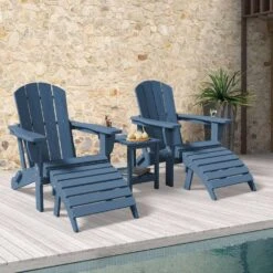 Navy Modern HDPE Plastic Adirondack Chairs, Outdoor Bar Stools With Connecting Tray (Set Of 2)